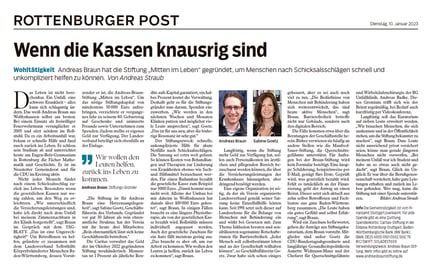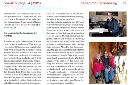 bei meinem Zimmernachbarn in der Klinik festgestellt“, sagt Braun im Gespräch mit dem TAGBLATT. „Das ist eine Ungerechtigkeit!“ Um Betroffenen zu helfen, gründete er zusammen mit dem Landesverband Selbsthilfe Körperbehinderter Menschen Baden-Württemberg, dessen Vorsitzender er ist, die Andreas-Braun-Stiftung „Mitten im Leben“.