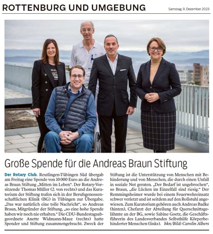 „Der Rotary-Vorsitzende Thomas Müller und das Kuratorium der Stiftung trafen sich in der Berufsgenossenschaftlichen Klinik (BG) in Tübingen zur Übergabe. „Das war natürlich eine tolle Nachricht“, so Andreas Braun, Mitgründer der Stiftung, „so eine hohe Spende haben wir noch nie erhalten.“ Die CDU-Bundestagsabgeordnete Anette Widmann-Mauz (rechts) hatte Spender und Stiftung zusammengebracht. Zweck der Stiftung ist die Unterstützung von Menschen mit Behinderung und von Menschen, die durch einen Unfall in soziale Not geraten. „Der Bedarf ist ungebrochen“, so Braun, „die Lücken im Einzelfall sind riesig.“